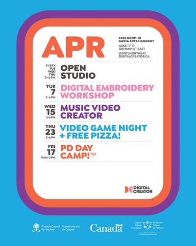 Digital Creator North Bay operates as a free, drop-in learning environment for youth aged 11 – 19 to acquire digital media skills. Staffed by artist mentors, the space is equipped to support interest-driven creative activities like 3D Printing, coding, graphic design, animation, videography, digital photography, podcasting and audio recording. Teens can also come in to work on homework, read, paint, draw, collage, or just hang out and play video games with friends!