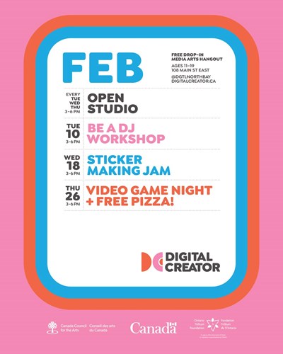 Digital Creator North Bay operates as a free, drop-in learning environment for youth aged 11 – 19 to acquire digital media skills. Staffed by artist mentors, the space is equipped to support interest-driven creative activities like 3D Printing, coding, graphic design, animation, videography, digital photography, podcasting and audio recording. Teens can also come in to work on homework, read, paint, draw, collage, or just hang out and play video games with friends!