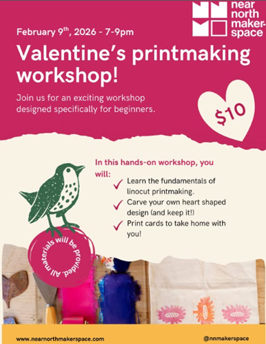 Join the Near North Makerspace on February 9th from 7-9pm for a Valentine's Day Printmaking workshop. Make your own design by carving out a heart shape and taking to home with you to make more cards at home. You leave with lots of cards!