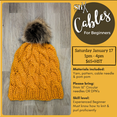 Ready to tackle a new knitting skill? Then join us to learn how easy this classic technique actually is! During this 3 hour workshop, you will learn how to read cable descriptions in patterns, and how to apply them to your knitting, while creating this beautiful warm toque! These hats knit up so quickly and the cable technique is so easy to master- it will leave wanting to make one for everyone you know!