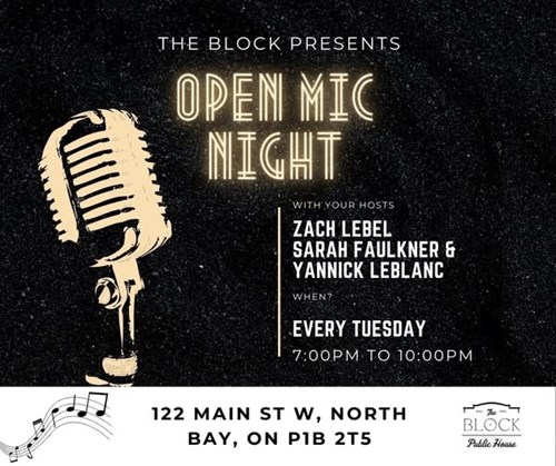 OPEN MIC TUESDAY!! Have you always wanted to shine onstage? Tuesday nights at the Block, we are now hosting open mic nights with local musicians Zach, Sarah and Yannick to back you up!! Come on out and show us your chops!!