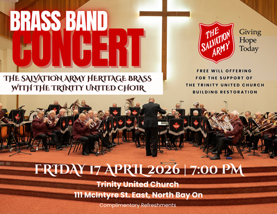 The Salvation Army Heritage Brass with Trinity United Church Choir present a Brass Band Concert on Friday April 17, 2026 starting at 7 pm. Held at Trinity United Church, 111 McIntyre Street East. Doors open at 6:30 pm, concert is at 7 pm. FREE WILL OFFERING for the support of Trinity United Church Building Restoration. Complimentary Refreshments following the concert.