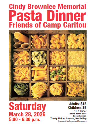 Join us for the Cindy Brownlee Memorial Pasta Dinner hosted by the Friends of Camp Caritou at Trinity United Church. Saturday March 28, 2026 starting at 5 pm to 6:30 pm.