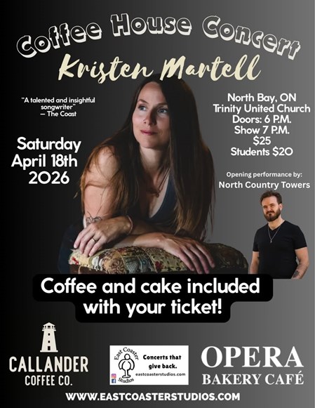 East Coaster Studios presents an Award-winning bilingual Nova Scotia artist, blending heartfelt folk/pop songs that linger long after the music fades! I'm excited to be bringing Kristen Martel to North Bay for the first time! To make things even better we have North Bay's own North Country Towers (Caleb Smith) performing an opening set of tunes.