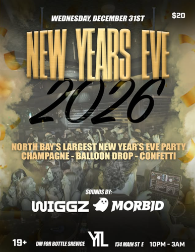 NYE 2026 at YTL ✨ Midnight champagne toast, balloon drop, confetti everywhere. @wiggzmusic and @morb1dxx setting the tone all night. North Bay’s biggest New Year’s Eve party. DM for bottle service. No tickets needed ($20 cover only)